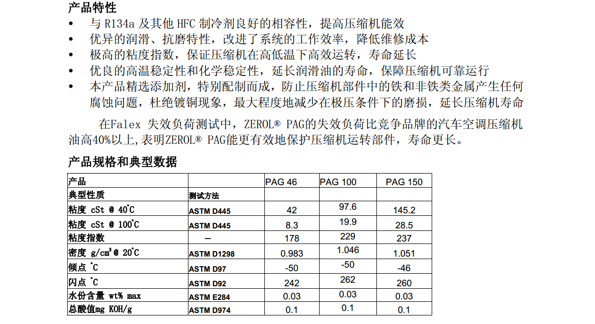 ZEROL?PAG系列的粘度包括46cSt,100cSt和150cSt(@40℃),不僅適用于R134a或其他HFC制冷劑,也與R12有良好的相容性,可用于準備把氟里昂R12改為R134a的舊汽車空調系統。 三分鐘極速報價 一對一免費選型咨詢 電話:400-860-8288