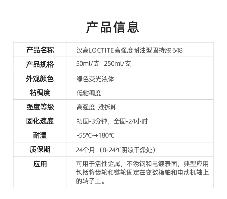 主要應用于粘接柱形配合件,特別是對熱強度性能有一定要求的場合。其應用范圍包括把齒輪和鏈輪固定在變速箱軸上,或將轉子固定到由電動機軸上。