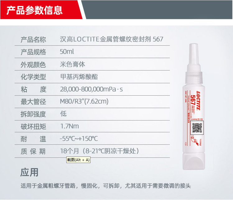樂泰567是一種用于錐形管螺紋密封的高性能密封膠。本產品是一種油膏狀厭氧型化合物。與空氣隔絕的情況下,在兩個緊貼的金屬表面之間固化。這種化合物的高潤滑性能夠防止不銹鋼,鋁和其他金屬制管螺紋和配件的咬合。