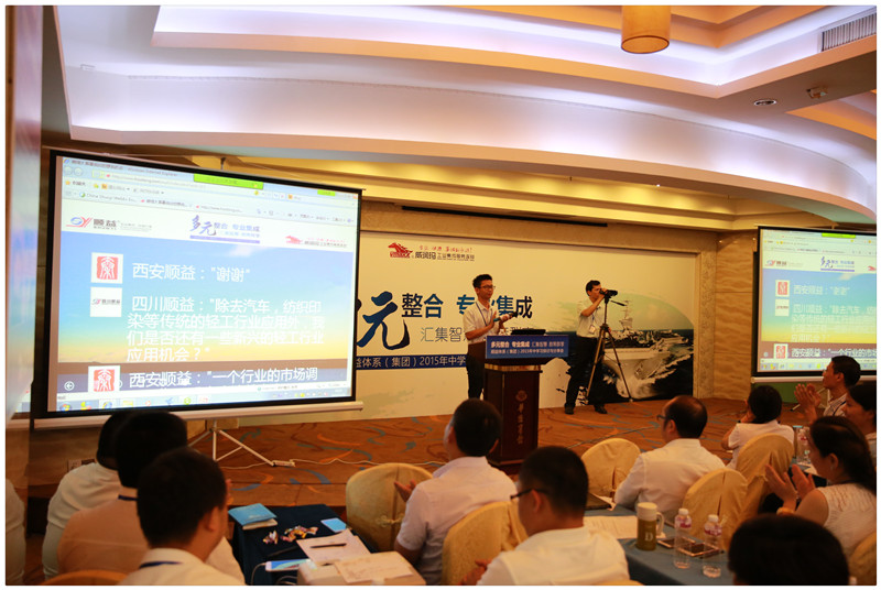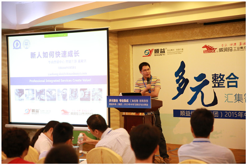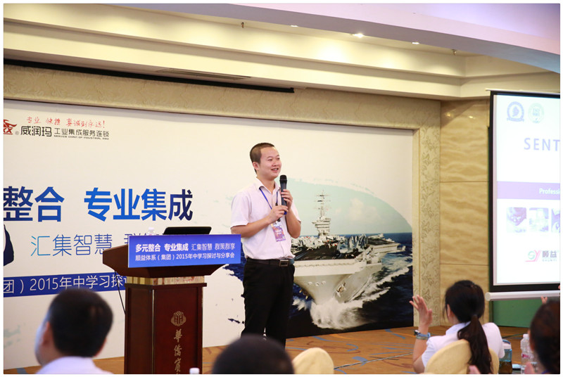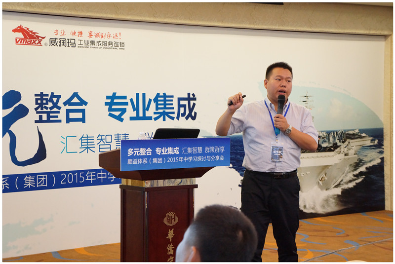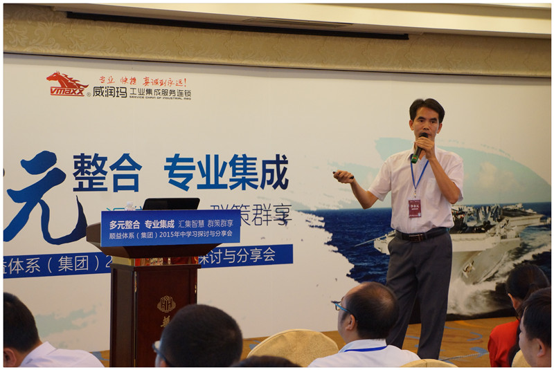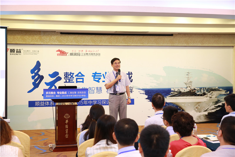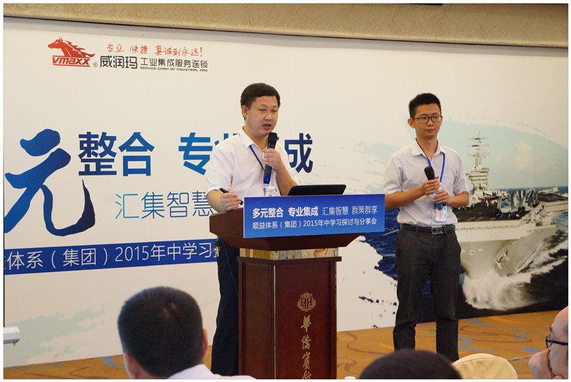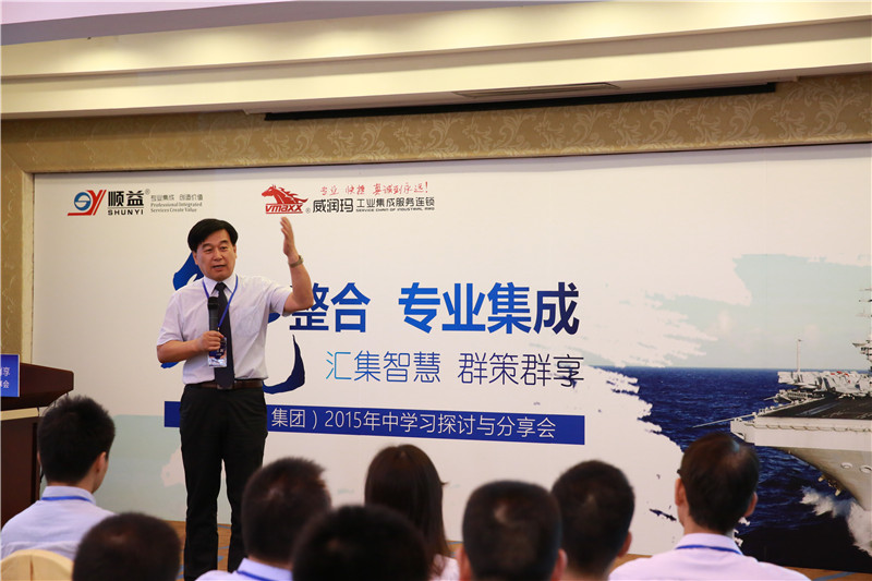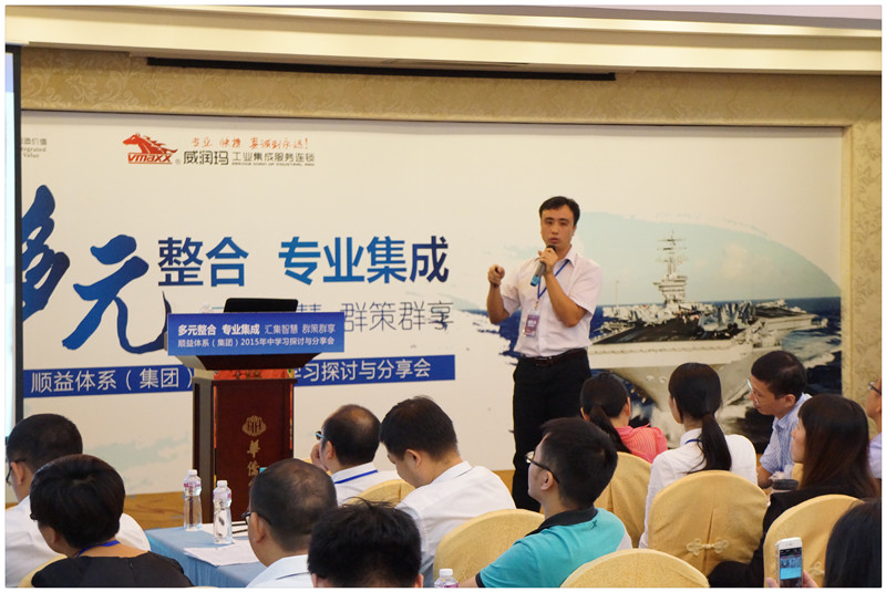 2015年7月25日,為了進一步推動專業(yè)集成與資源整合,順益體系(集團)“多元整合 專業(yè)集成 匯集智慧 群策群享”工業(yè)集成學習交流會暨2015年中學習探討與分享會在珠海華僑賓館華麗宮會議廳召開。順益體系(集團)總裁張建新、學府咨詢(國際)集團有限公司首席專家董事長、TnPM管理體系創(chuàng)始人、國際知名設備管理專家李葆文教授等出席了會議。順益體系(集團)經(jīng)銷商、威潤瑪加盟商、及全國40家分公司及辦事處的員工代表等200余人參加了此次會議,另場外分公司及辦事處同事同步使用視頻會議系統(tǒng)和運用微信墻進行了場外提問。