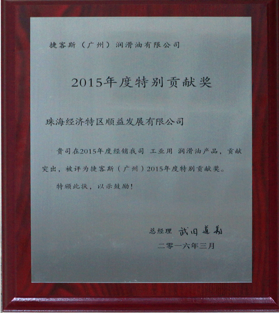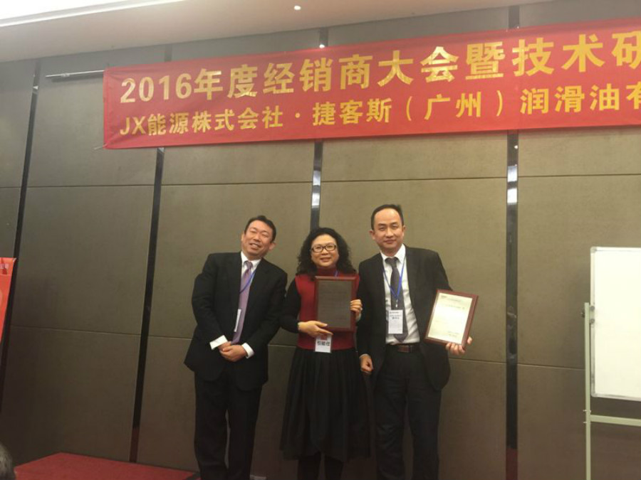 順益體系(集團)在與JX集團多年友好合作中,已連續4年獲得了“捷客斯(廣州)年度金牌代理店”榮譽。在本次大會上,2015年,順益在新產品推廣及業績表現突出,榮獲了2015年度新產品推廣獎和2015年特別貢獻獎兩項大獎。
