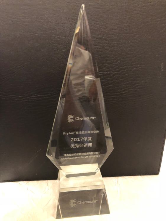 在充滿挑戰(zhàn)的2017年里,珠海經(jīng)濟(jì)特區(qū)順益發(fā)展有限公司在Krytox?高性能潤(rùn)滑油業(yè)務(wù)領(lǐng)域業(yè)績(jī)突出業(yè)績(jī)表現(xiàn)突出,榮獲科慕Chemours 2017年度優(yōu)秀經(jīng)銷商獎(jiǎng)。