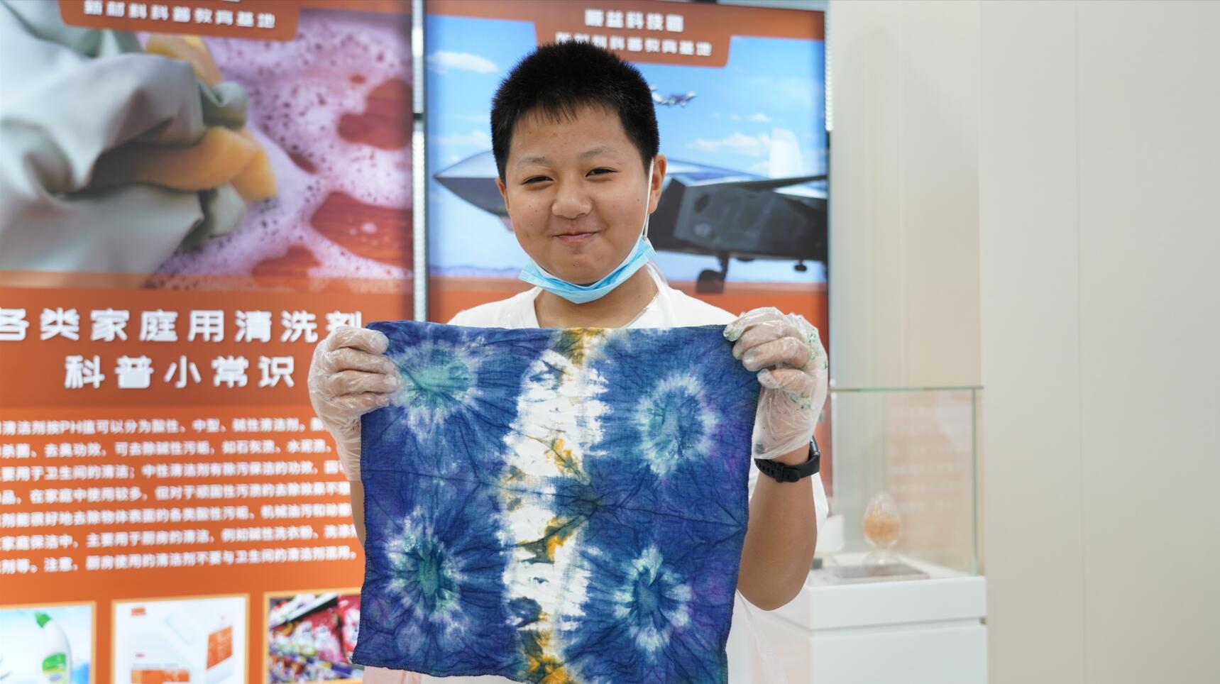 自由創作環節,同學們想法獨到,每一件作品也都樣式不一。過程中,科普老師細致講解、耐心幫助指導。扎好的布料染色的那一刻,同學們表示激動又期待。當一件件各具特色、花樣別致的作品呈現在眼前時,大家紛紛感嘆扎染的精妙。取出作品展示,藍的、紅的、花色條紋,每一件都別出心裁,形成了獨有的一道靚麗風景線。