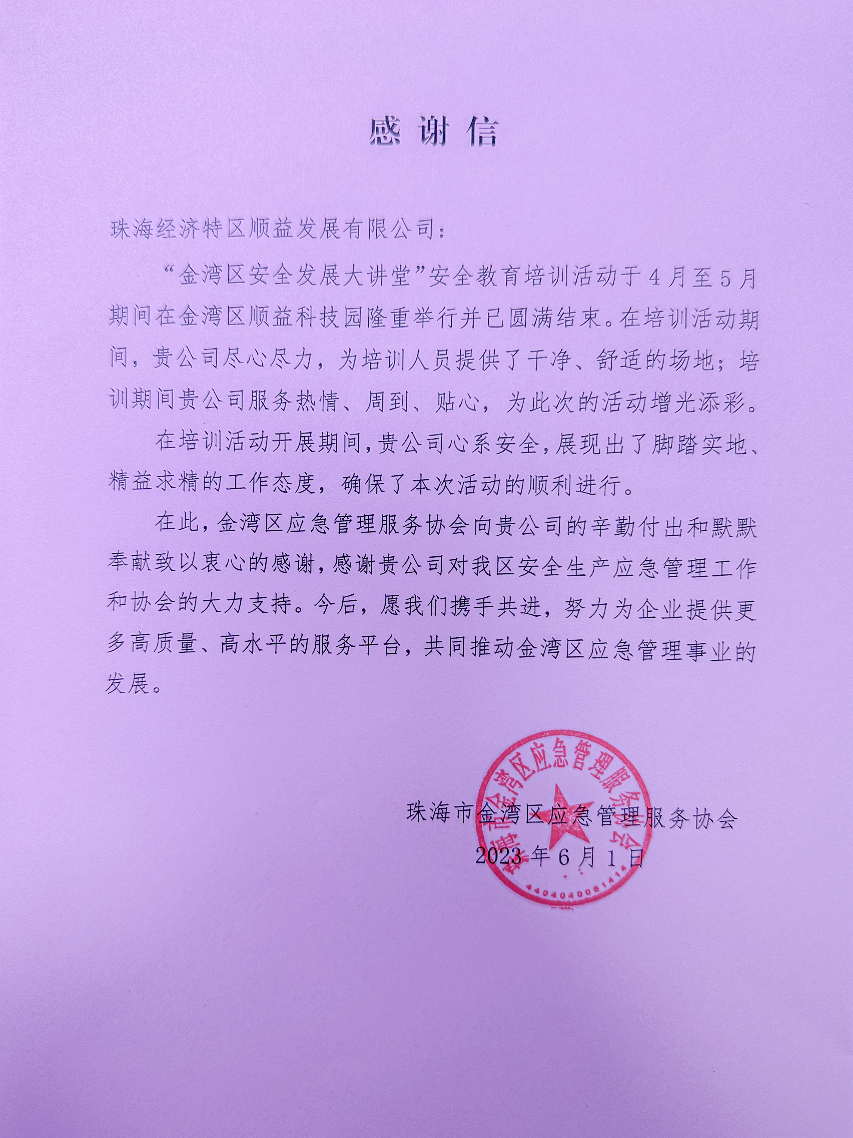 7月28日,珠海市金灣區(qū)應(yīng)急管理服務(wù)協(xié)會(huì)秘書長(zhǎng)楊明為我司送來繡著“心系安全 鼎力支持 熱情周到 精益求精”的錦旗及感謝信。對(duì)我司在2023年4月至5月期間協(xié)助珠海市金灣區(qū)應(yīng)急管理局、珠海市金灣區(qū)應(yīng)急管理服務(wù)協(xié)會(huì)在順益科技園開展的“金灣區(qū)安全發(fā)展大講堂”安全教育培訓(xùn)中的會(huì)務(wù)工作給予高度的評(píng)價(jià)和衷心的感謝。
