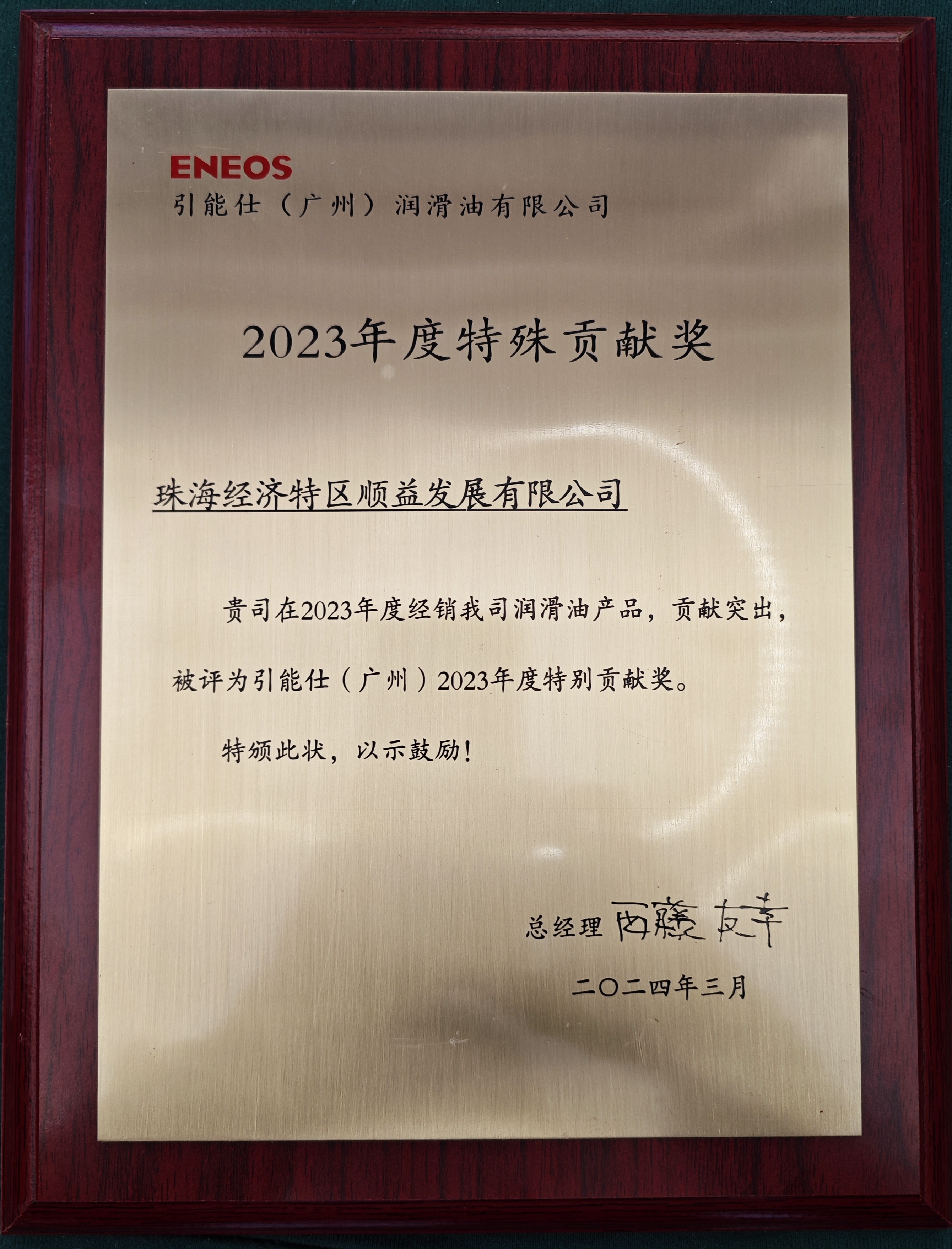 珠海經(jīng)濟(jì)特區(qū)順益發(fā)展有限公司榮獲引能仕(廣州)潤(rùn)滑油有限公司“2023年度特殊貢獻(xiàn)獎(jiǎng)”。成為引能仕在中國(guó)市場(chǎng)優(yōu)秀的合作伙伴之一。順益(體系)集團(tuán)副總裁張海紅上臺(tái)領(lǐng)獎(jiǎng)。