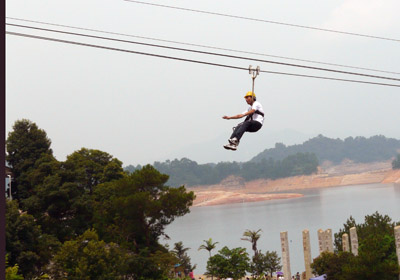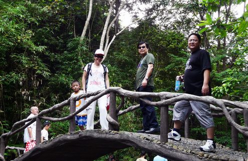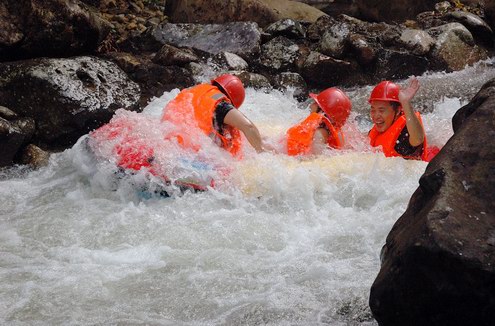到了目的地,品嘗完當地特色菜肴后,便開始了我們的驚險刺激的環節—漂流!大巴車穿過了高山的N道彎,風景美,地勢險,要漂流的朋友們,興奮之余,想必也多少有些怕怕。下了車,再徒步到更高的山上,山中水霧迷漫,水流時而涓涓,時而飛急,四處蔥蔥郁郁,時而小橋,時而彎彎石徑,浪漫清幽…….終于到達漂流的源頭了,大家急急更換行頭,像小魚躍水一般,迫不及待了!水中急流的魚兒們終于到了漂流的終點,個個是意猶未盡,大呼過癮!