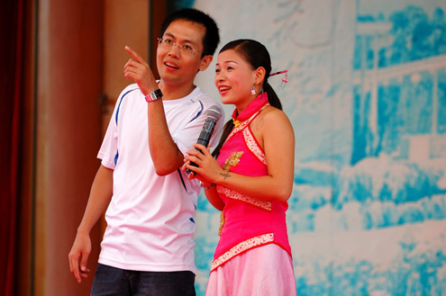 上岸后,觀看表演,這是非常值得一提的,參與表演的男主角,是我們的黃大帥哥。劇名:新郎取親。主演的角色是新郎官,面對媒婆的辛辣刁難,我們黃大帥哥毫不畏懼,兵來將擋,水來土擋,又唱又跳,用他特有的幽默與機智,過了無數“機關”,同時,也折服了臺下的所有觀眾,贏得了無數的笑聲和掌聲!