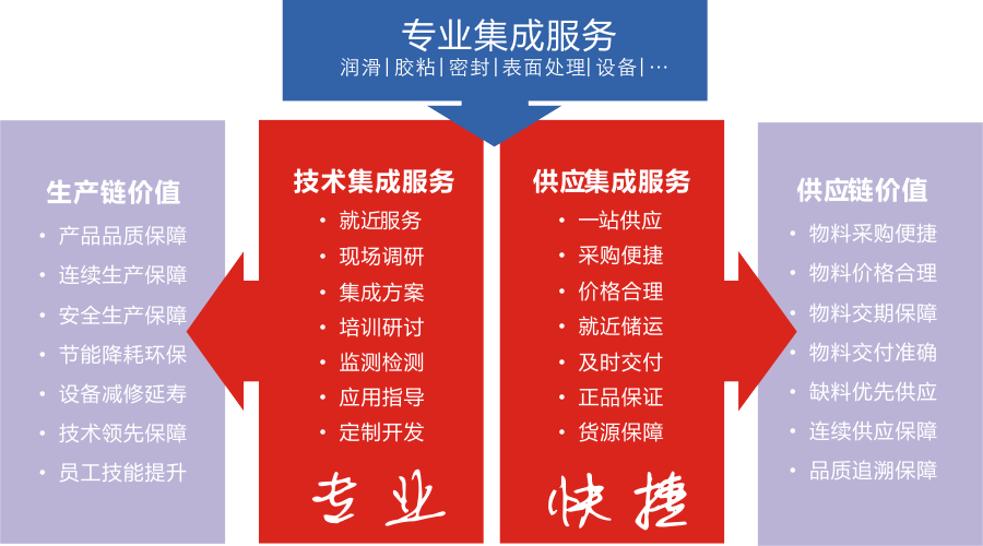 在工業(yè)企業(yè)中的潤滑、膠粘、密封、表面處理等關(guān)聯(lián)的領(lǐng)域,無論是BOM直接物料,還是MRO非生產(chǎn)性物料,都具有針對性強(qiáng)、消耗量大、重復(fù)消耗等特點(diǎn),因而更受到采購部門的關(guān)注,迫切希望對物料和供應(yīng)商進(jìn)行整合,以降低直接和隱形的采購成本;同時(shí),這些化學(xué)類的物料,不同于工具、五金件之類的物料,在使用上具備很強(qiáng)的專業(yè)性,對應(yīng)用技術(shù)服務(wù)有著較高的要求,因此,研發(fā)、使用部門亦迫切地希望具備專業(yè)技術(shù)能力的服務(wù)商能提供專業(yè)快捷的現(xiàn)場服務(wù)。顯而易見,上述領(lǐng)域的集成服務(wù)具有整合的價(jià)值,受到客戶的關(guān)注,也具有長期持續(xù)的經(jīng)濟(jì)價(jià)值。
